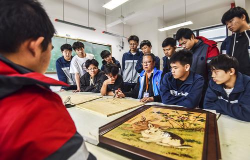 近日,在资溪县中等专业学校教室里,省级非物质文化遗产代表性传承人李乃江(图中)在指导学生制作竹烙彩画。该县开展民俗、传统技艺、美术、美食等技能传承培训,推动当地旅游和文化产业融合发展。特约通讯员 吴志贵摄